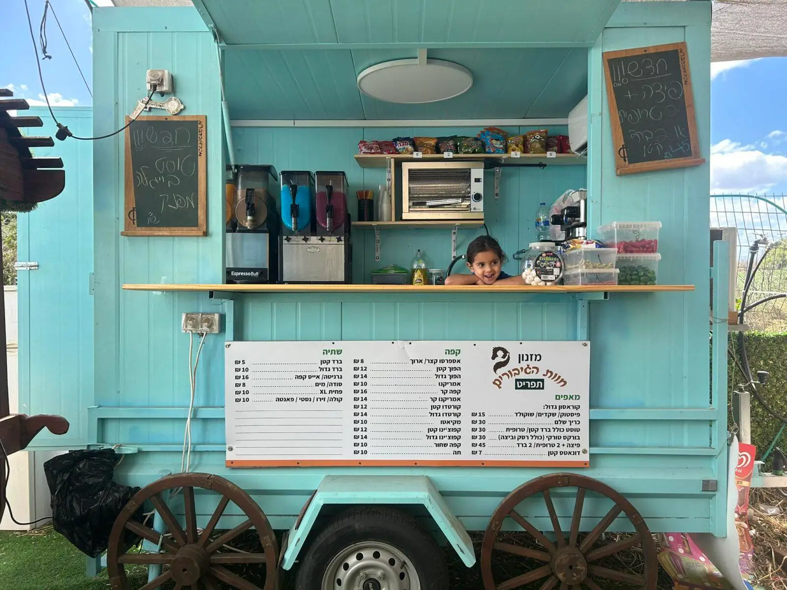 סיפור העגלה: אספרסוס היא הרבה יותר מעגלת קפה רגילה – זה מקום עם סיפור, עם נשמה ועם חיבור אמיתי לאנשים ולטבע. שמעון ואלה, מטפלים ברכיבה טיפולית במקצועם, הקימו את המקום הזה מתוך רצון לשלב בין אהבתם לסוסים לבין אהבתם לאירוח ולקפה איכותי. השם אספרסוס נולד ממשחק מילים בין "אספרסו" ל"סוס", ומי שמגיע לשם מבין מיד את החיבור – קפה טוב, טבע פתוח, וחווית בילוי משפחתית בלב חוות סוסים קסומה.
