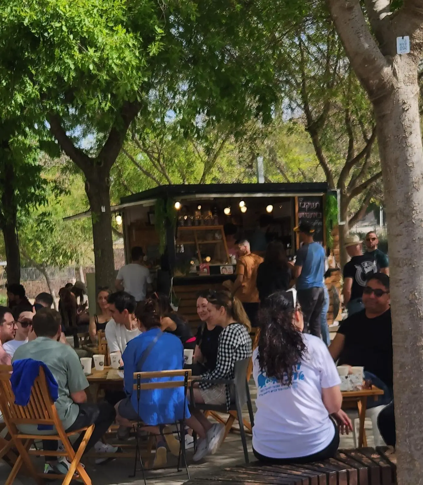מה צריך לדעת על הלוקיישין: המון מקומות ישיבה בין העצים סמוך לגן שעשועים וליד שוק איכרים שסוגר את כל הפינות לקניות של שישי.