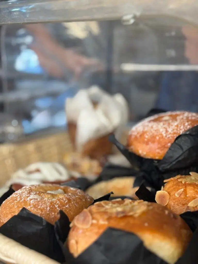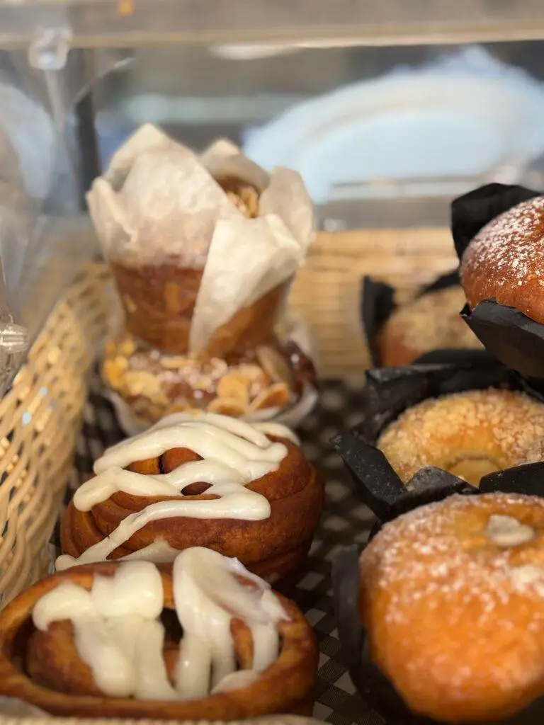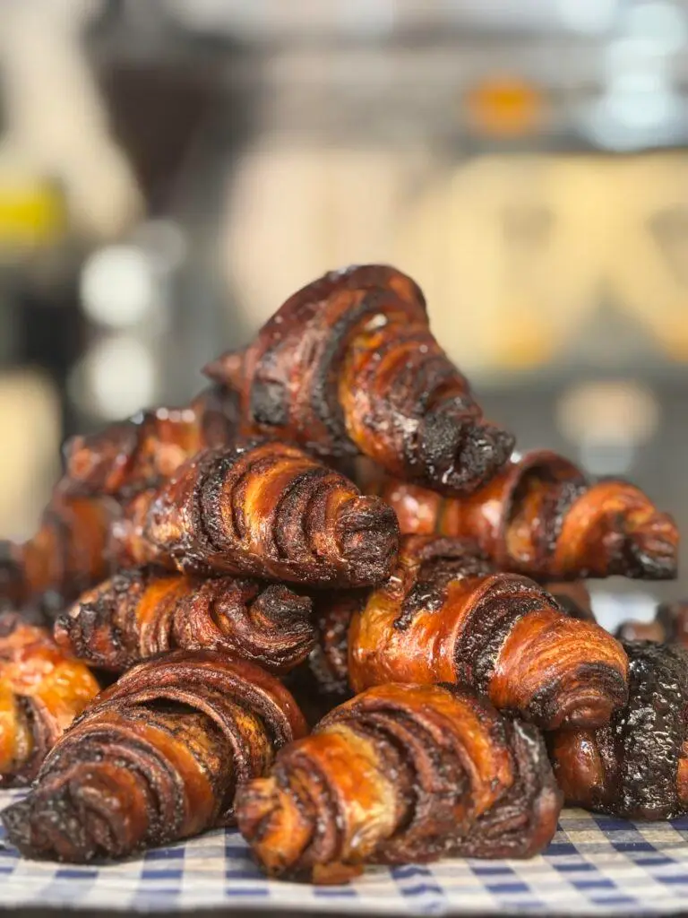 הקינוחים: קרואסונים פריכים בשלל מילויים, עוגות טריות שמתחלפות, כדורי שוקולד ורוגעלך חם מהתנור