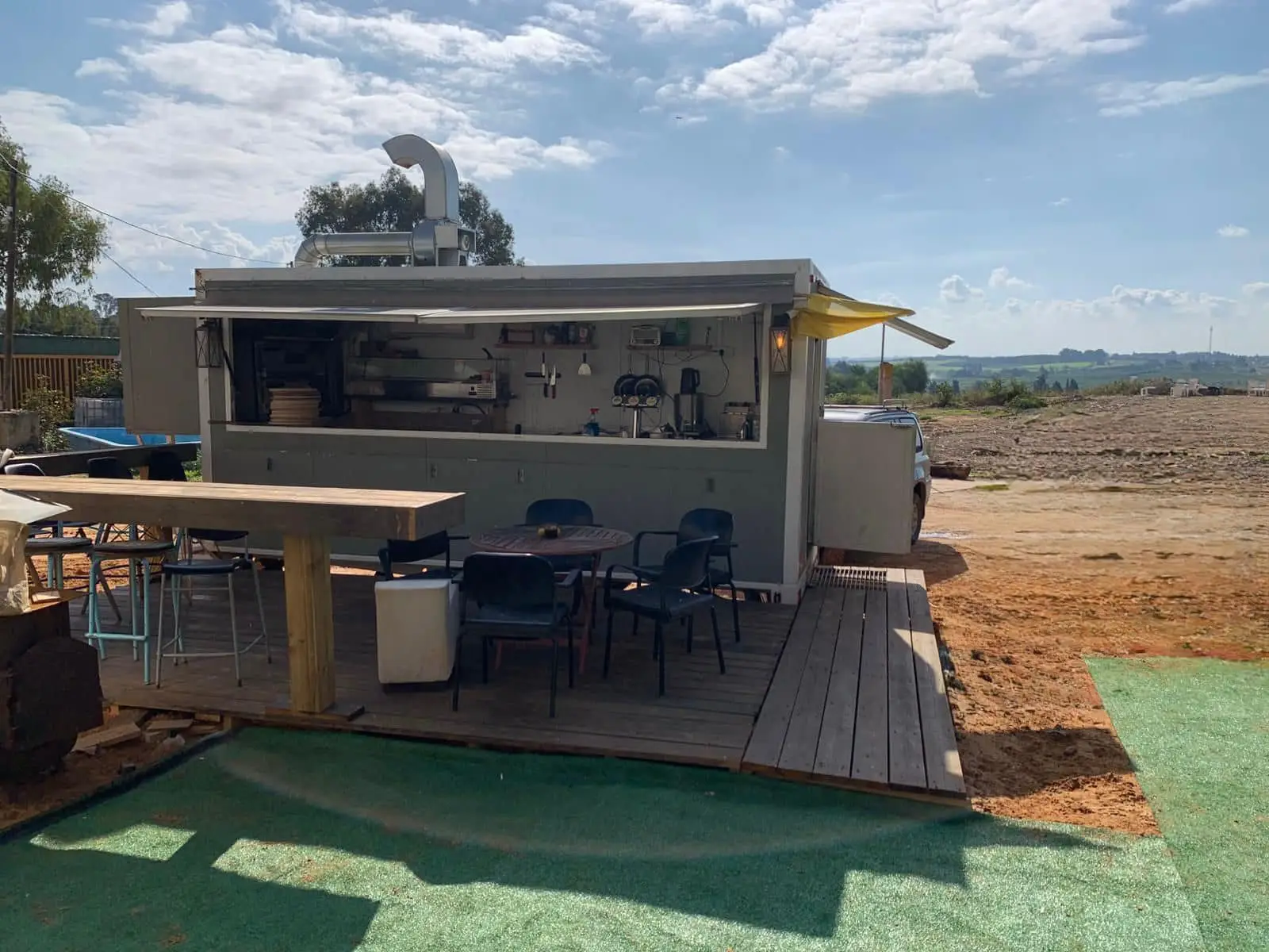 נוף עוצר נשימה: עגלת הפיצה ממוקמת בנקודה מושלמת שמשקיפה על הפרדסים של תל יצחק. זה לא רק המקום שבו אוכלים פיצה, אלא גם המקום שבו מתנתקים מהשגרה.