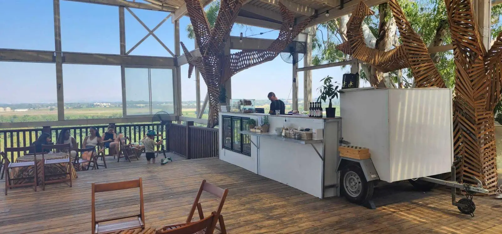 עגלה של קפה בית הראשונים עם הנוף הכי מושלם בעמק חפר.